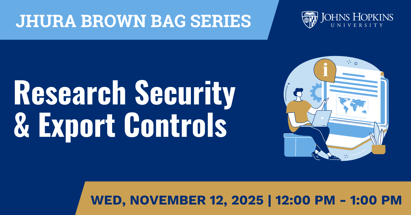 Join Johns Hopkins University Research Administration (JHURA) on Wednesday, November 12, 2025, from 12 PM – 1 PM, for a Brown Bag on Research Security and Export Controls.