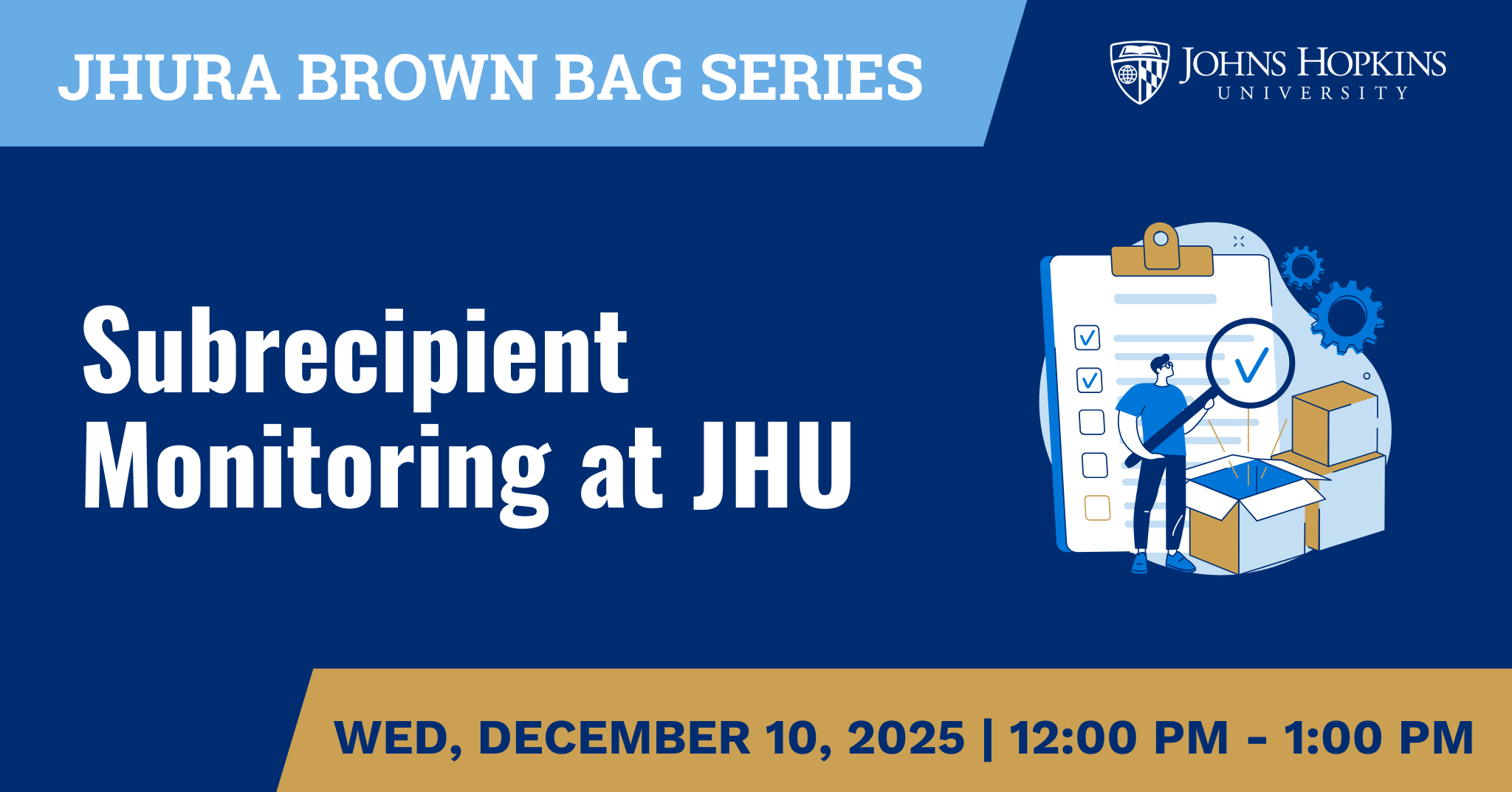 Join Johns Hopkins University Research Administration (JHURA) on Wednesday, December 10, 2025, from 12 PM – 1 PM, for a Brown Bag on Subrecipient Monitoring.