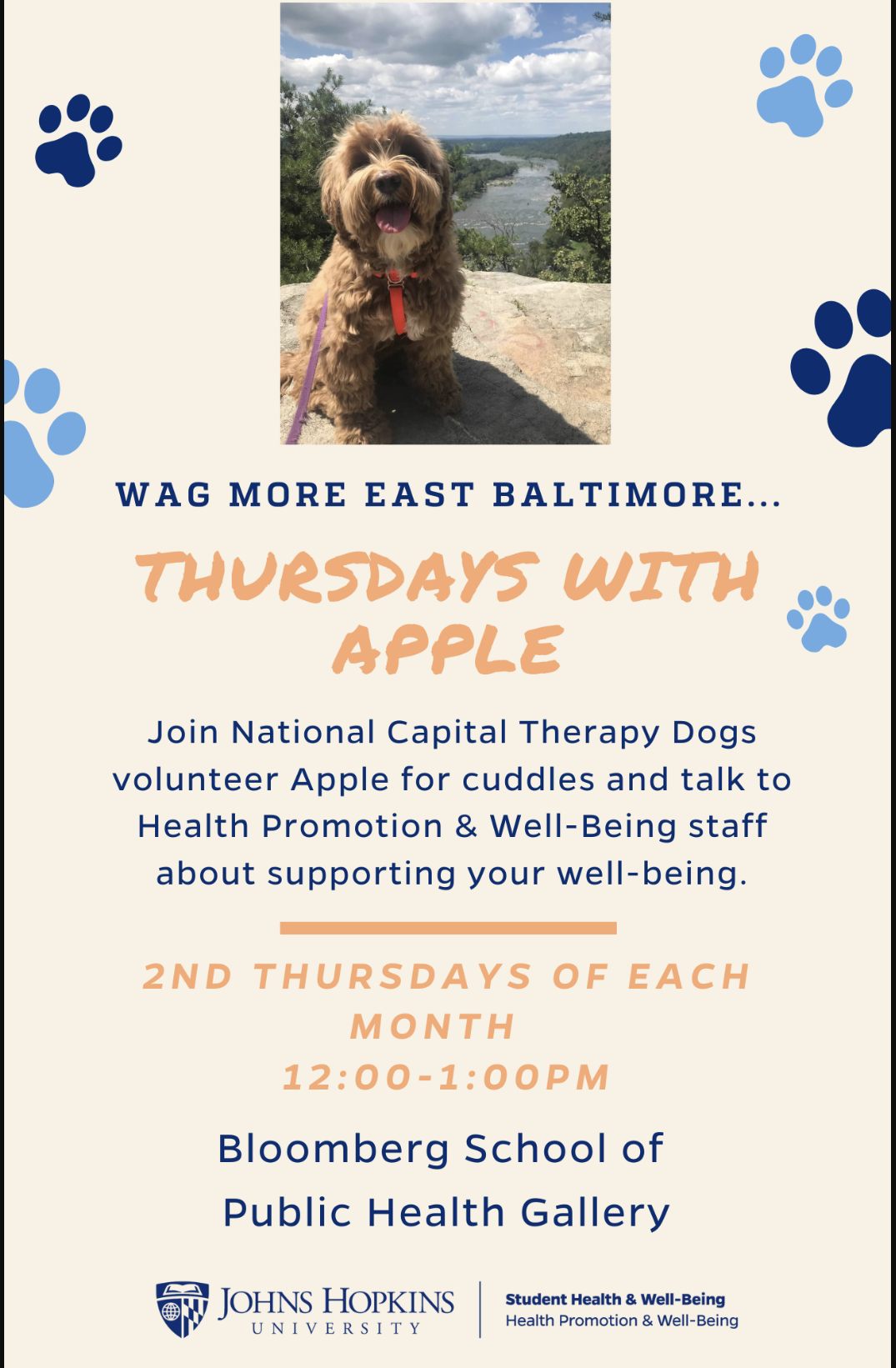 Hey East Baltimore, let’s wag more! Come meet Apple at the School of Public Health for snuggles and pets. You can also talk with Health Promotion & Well-Being staff about supporting your well-being. Taking time for a visit is sure to brighten your day and put a smile on your face. Apple visits BSPH from 12-1pm on the 2nd Thursday of each month Oct- May (except no visit in January) in the BSPH Gallery. For disability accommodations, please email Carol Spencer: [email protected]