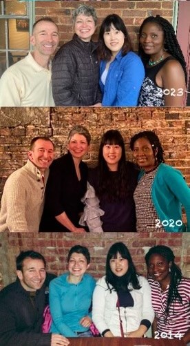 Such a background is essential for re-creating a group image taken way back at a post-graduation going-away party for Kim, who had earned the “ultimate public health nursing job,” according to Pfaff—as a public health nurse in Alaska. “Riding the planes, dealing with botulism. Botulism! Home visits in remote Alaskan communities,” Pfaff says. “Wow!” That photo, and the snapshots taken each time the four meet up, present visual evidence of a moment when—as fresh grads of the Public Health Nursing program in December 2013—Wenga, Pfaff, Kim, and Lindsley realized that a bond forged at school was ending, and didn’t have to break at commencement. In fact, it couldn’t.