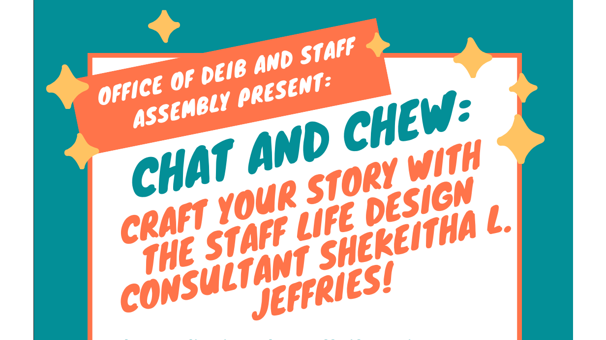 The next JHSON Office of Diversity, Equity, Inclusion and Belonging Chat and Chew, 12:30-2 pm Thursday, October 23, SON N231, presents “A deeper dive into the Staff Life Design Process” led by Shekeitha L. Jeffries.