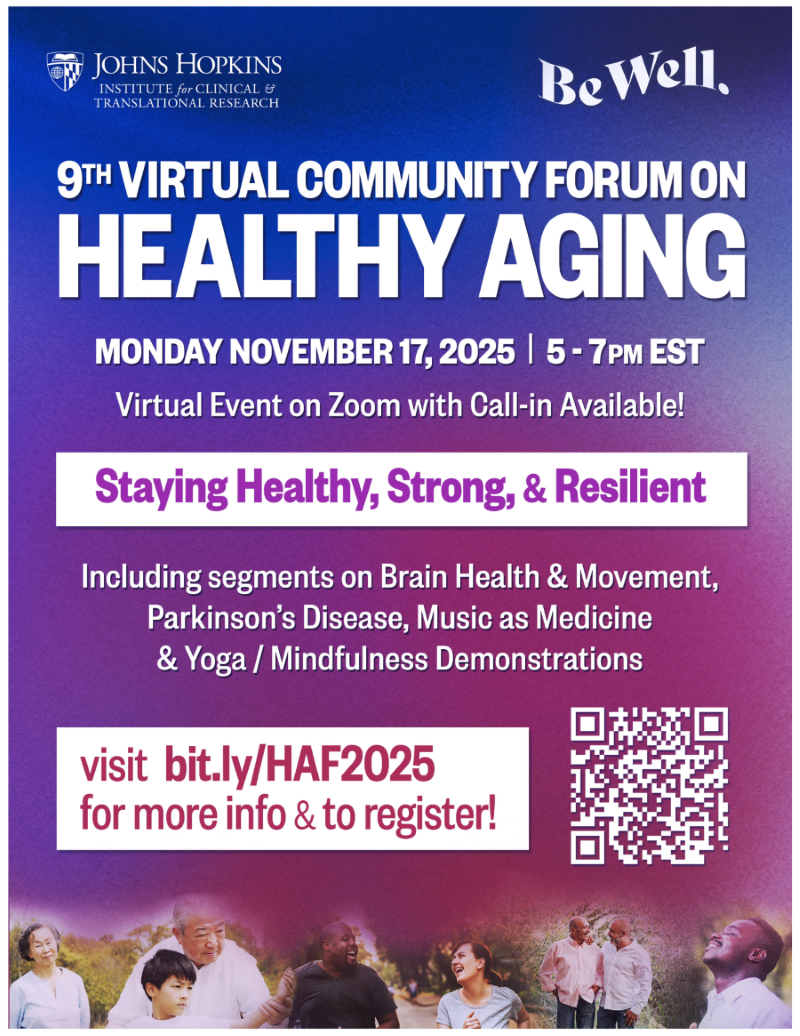 Join the Johns Hopkins Institute for Clinical & Translational Research for the 9th Annual Community Forum on Healthy Aging 5-7 pm Monday, November 17. This virtual forum offers a dynamic experience featuring fitness demonstrations, expert-led panel discussions, and engaging community conversations focused on health and wellness topics relevant to our communities. Our goal is to foster authentic dialogue, encourage community connection, and develop shared strategies for staying strong, resilient, and healthy as we age. We welcome you to be a part of this important conversation. Let’s celebrate the journey of aging—together.